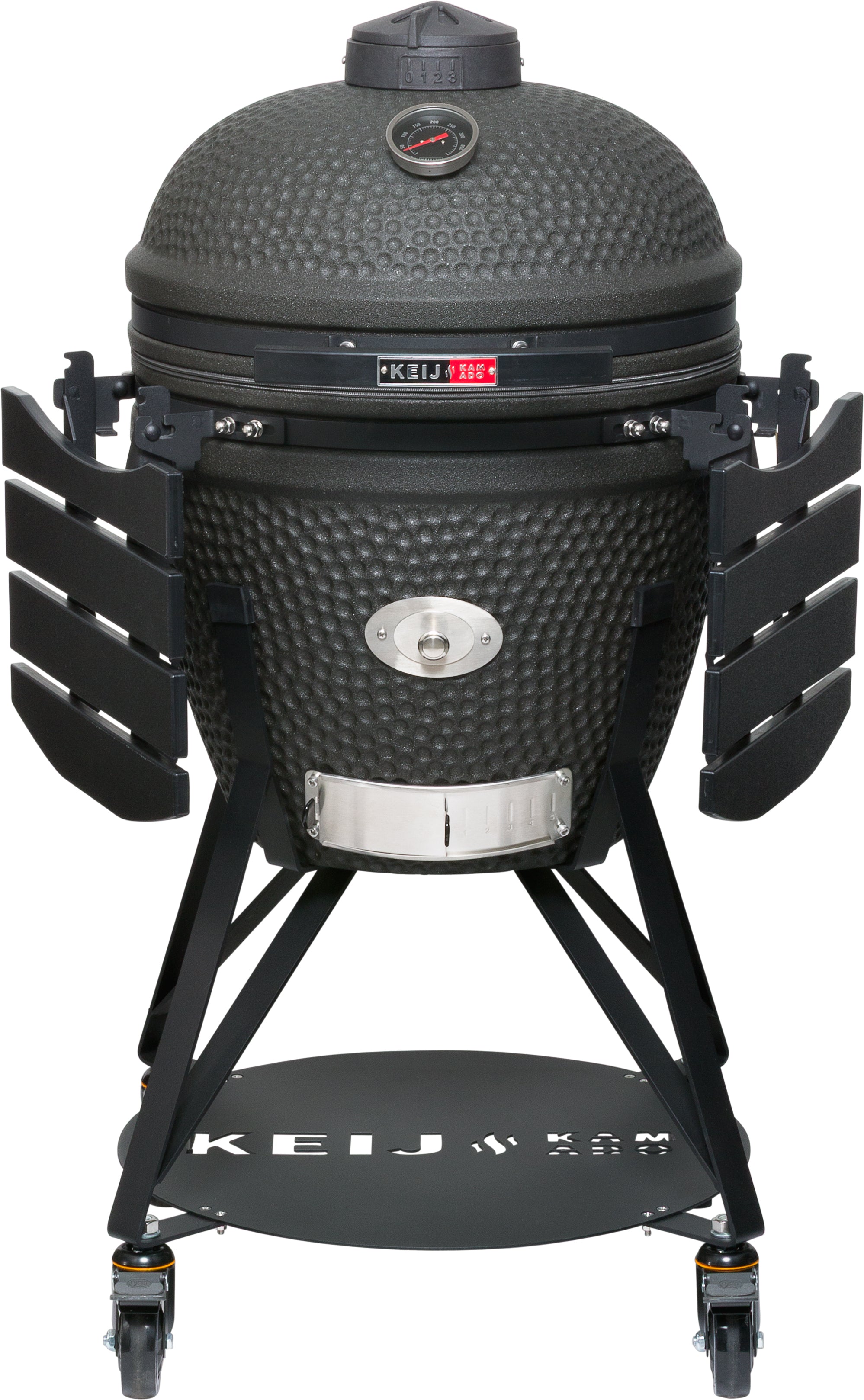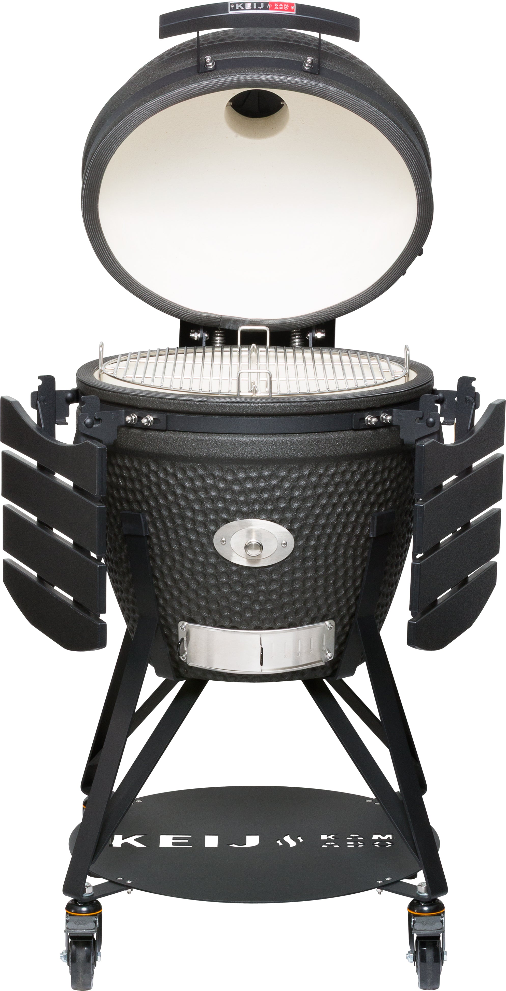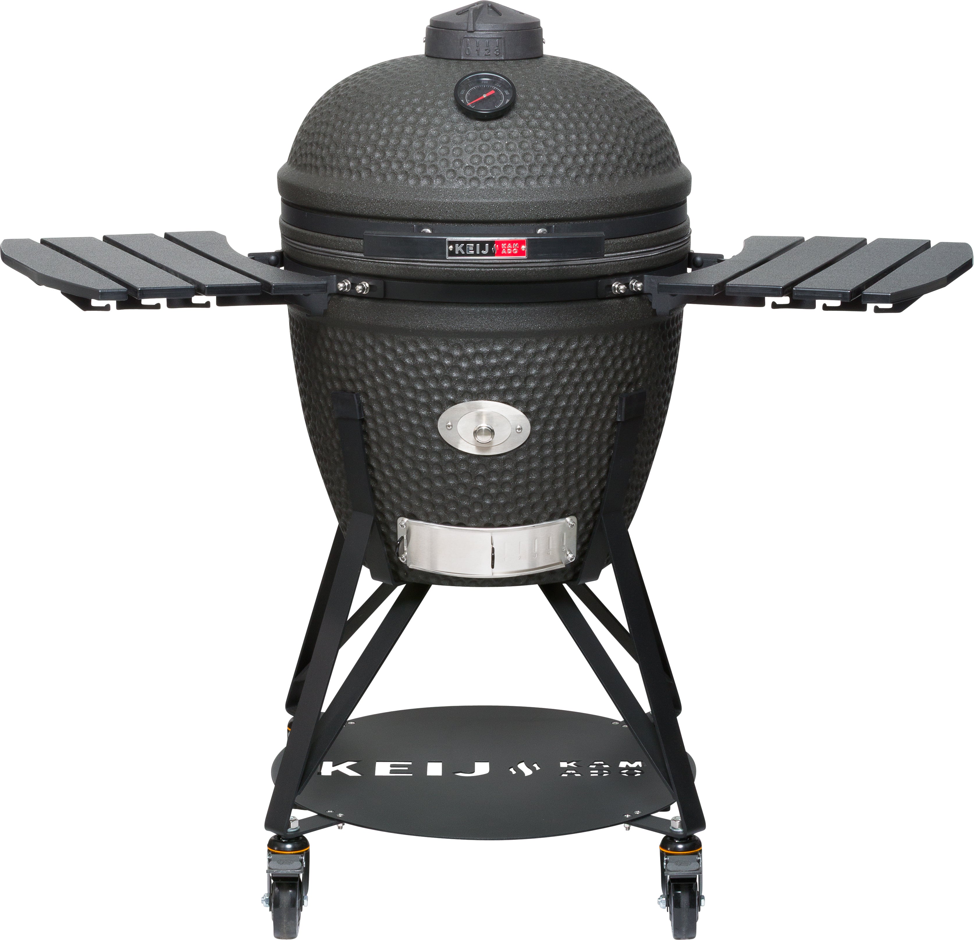 De Keij Kamado Pro Large, de ultieme keramische barbecue die de strijd aangaat met de grote merken! Uitgerust met HDPE zijtafels en handvat, een handige chipfeeder voor toevoer van rookhout en een extra dikke keramische vuurschaal is deze barbecue een echte krachtpatser. De Keij kamado is gemaakt van hoogwaardig dikwandig cordieriet keramiek dat uitermate goed bestand is tegen extreme hitte. De gietijzeren onderdelen zijn professioneel gepoedercoat en het extra grote rooster is gemaakt van roestvrij staal. Hierdoor kan het hele gezien jarenlang plezier beleven aan deze kamado.