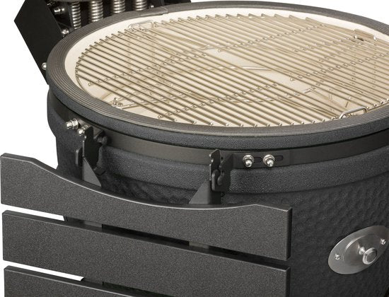 De barbecue is gemaakt van zeer hoogwaardig dikwandig cordieriet keramiek en de gietijzeren onderdelen zijn professioneel gepoedercoat. Hierdoor zul je zeer lang plezier beleven van deze Kamado. Of je nu een feest geeft of gewoon met je gezin wilt grillen, deze barbecue is er klaar voor.