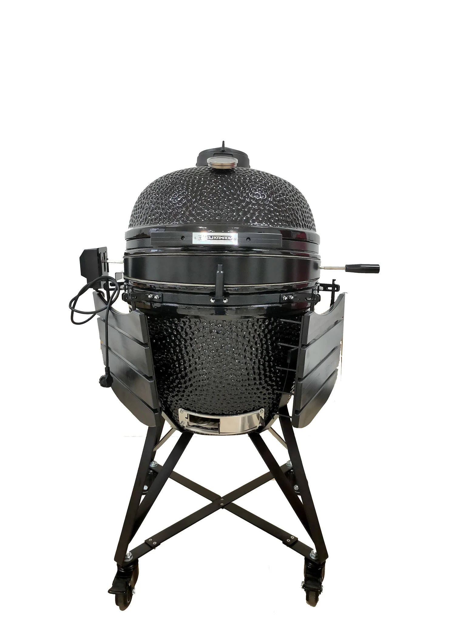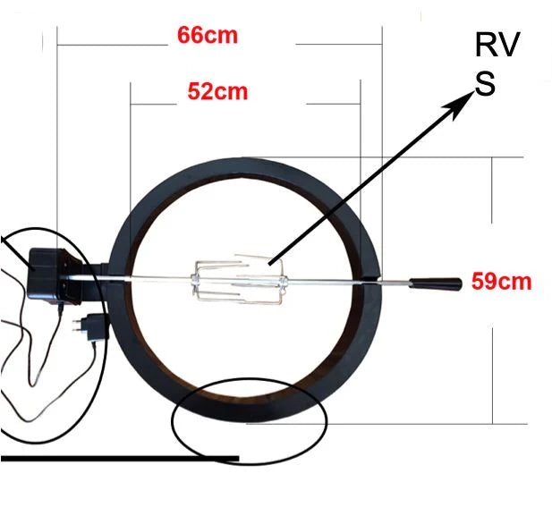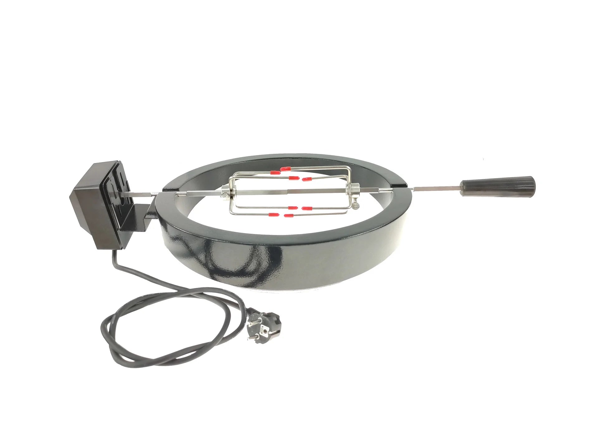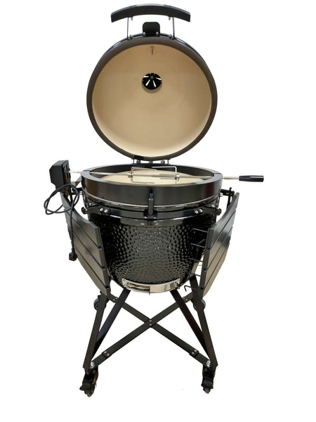 De perfecte rotisserie voor je Kamado. De ring is gemaakt van gepoedercoat staal en het spit is van RVS. Doordat de ring naar achteren toe schuin afloopt, sluit de Kamado goed af en blijft de warmte in de BBQ en wordt de luchtcirculatie zo min mogelijk verstoord. De motor draait op 230 volt en is fluisterstil.